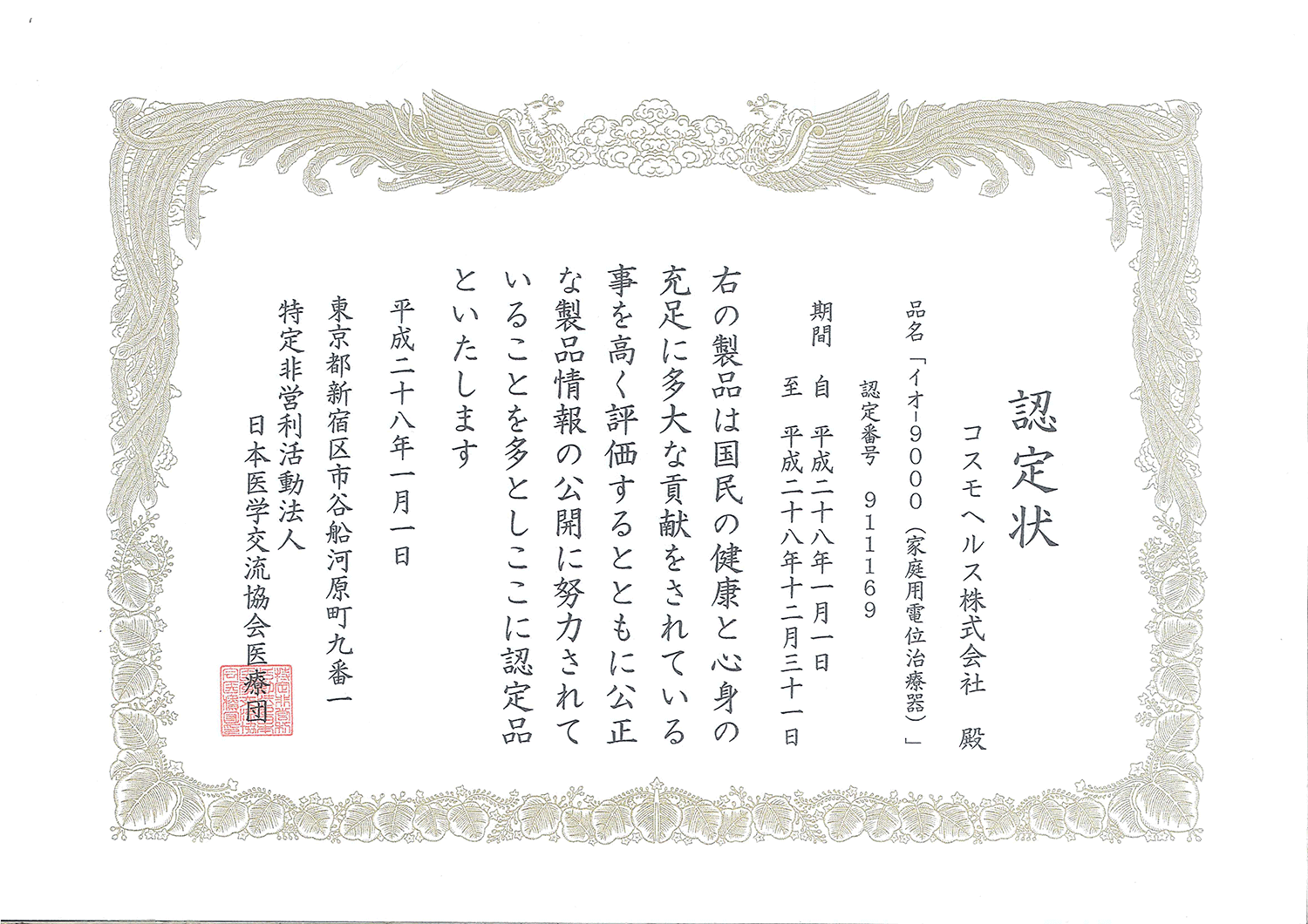 平成6年,經日本醫學文流協會嚴格審查後的醫療儀器中,COSMO Dr高電位治療器被評為